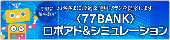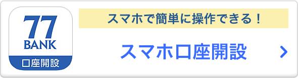 重要2026年03月17日15時00分 【緊急】銀行を装ったSMSや電子メールにご注意ください! 重要2025年12月26日15時00分 在留期間が経過した外国籍のお客さまとの預金取引について 重要2025年11月18日13時00分 【重要】銀行名を騙る自動音声電話等への注意喚起について 重要2025年08月13日13時30分 不正取引防止への取り組み(取引制限等)について 個人のお客さま 〈七十七〉ダイレクトサービス サービスのご案内 ログイン 初めての方はこちら 各種手続きはこちら 法人のお客さまはこちら 重要なお知らせ 重要当行に届け出ている在留期間が経過した外国籍のお客さまとの預金取引について 重要銀行名を騙る自動音声電話等への注意喚起について 重要定期的なお客さま情報のご提供に関するご協力のお願い もっと見る 【重要】お客さま情報(暗証番号等)の取扱に注意 金利情報 手数料一覧 来店予約サービス 店舗・CSコーナー お問い合わせ先一覧 閉じる チャットで質問する 閉じる キャンペーン・おすすめ情報 キャンペーン一覧 目的からさがす ためる・ふやす かりる 将来にそなえる 口座をつくる・つかう 相談する その他のサービス・機能 普通預金・定期預金 投資信託 NISA(少額投資非課税制度) 〈七十七〉ファンドラップ 外貨預金 個人型確定拠出年金(iDeCo) 公共債 金融商品仲介 ためる・ふやすトップページ 住宅に関するローン 車に関するローン 教育に関するローン フリーローン カードローン ご相談・サポート かりるトップページ 損害保険商品(住宅ローン利用者向け火災保険) 損害保険商品(アパートローン利用者向け火災保険) 生命保険商品 セカンドライフ・サポートメニュー 将来にそなえるトップページ 口座開設のステップ 七十七銀行のカードサービス 〈七十七〉ダイレクトサービス ATM機能 ATM提携 各種規定 口座をつくる・つかうトップページ ローンセンターのご案内 ほけんプラザのご案内 相続に関するご相談 金融円滑化に関するご案内 自然災害等の影響による債務整理のご相談 相談するトップページ 77ポイントサービス 外国送金 インターネット支店 トラベレックスジャパン株式会社との提携サービス Pay-easy(ペイジー)「口座振替受付サービス」 Bank Pay 七十七銀行PayB(公共料金支払いアプリ) Web口振受付サービス 保管サービス 七十七銀行toto AIRPOST ATM手数料優遇サービス ペンリィ その他のサービス・機能トップページ オンラインサービス お店に行かずに審査・お申込み WEB完結型ローン お店に行かずにお申込み インターネット保険 インターネットでさまざまなお取引き <七十七>ダイレクトサービス 毎月の返済額が簡単にわかる 返済シミュレーション スマホで残高照会・楽しく貯蓄 七十七銀行アプリ お客さまからいただく質問にお答え よくあるご質問(FAQ) ワンコインから始められる インターネット投資信託 預金をキャッシュレスで利用 77JCBデビット 通帳もデータ保存ですっきり WEB通帳 商品概要(金利・手数料) 金利情報 手数料情報 商品概要説明書 マーケット情報(為替相場・投資信託基準価額) 為替相場 投信ファンド情報 マーケット情報 そのほかのご案内 お役立ち情報(外部サイト) 七十七銀行の取り組み 当行の災害対策 東日本大震災に関するお知らせ 地域創生の取組み バリアフリーへの取組み トピックス ニュースリリース 注意喚起 お知らせ セミナー・相談会 一覧 2026年4月9日NEW株式会社佐元工務店に対する77ポジティブ・インパクト・ファイナンスの融資実行について 2026年4月9日NEW株式会社清月記に対する77サステナブルオーダーローンの融資実行について 2026年4月7日「七十七キャピタル第3号投資事業有限責任組合」の投資実行について(株式会社New Space Intelligence) 金融犯罪などにご注意ください 当行に届け出ている在留期間が経過した外国籍のお客さまとの預金取引について マネー・ローンダリング等防止にかかる当行の方針 インターネットバンキングの不正利用にご注意ください。 七十七銀行に類似したサイトにご注意ください。 不審な電子メールにご注意ください 金融庁職員、警察官、銀行協会職員および七十七銀行員等を騙る詐欺にご注意ください 「振り込め詐欺等の犯罪被害資金返還」への対応について 預金等の不正引出被害に対する補償の実施について キャッシュサービスコーナー廃止のお知らせ(女川町地域医療センター出張所、米谷出張所) 振込規定等改定のお知らせ 振込不能時における振込資金のお取扱方法変更について 義援金振込のご案内(2026年4月1日現在) 当座勘定規定等改定のお知らせ 振込手数料の改定に伴うEBサービス専用ソフトの操作手順のお知らせ <七十七>ファンドラップ投資一任契約約款、<七十七>ファンドラップ投資一任契約 代理人特約約款および<七十七>ファンドラップ投資一任契約 資産承継特約約款 兼<<七十七>ファンドラップ投資一任契約専用>贈与契約約款の改定について <七十七>教育資金贈与専用口座の新規取扱停止について ATMを利用したワイズ・ペイメンツ・ジャパン株