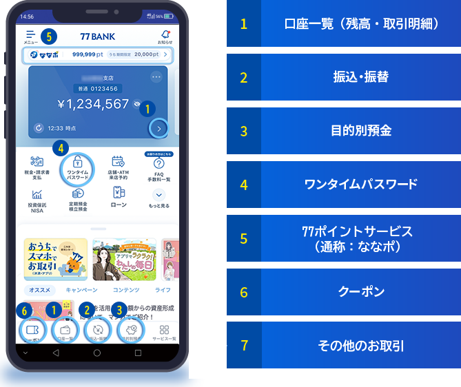 ※1.60秒毎に変更となる8桁の数字からなる使い捨てのパスワード(ワンタイムパスワード)を発行する七十七銀行アプリの機能です。