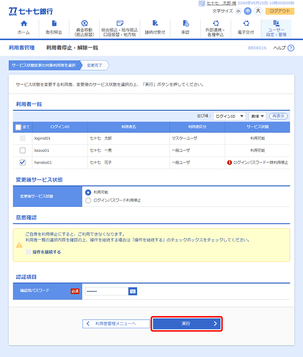 サービス状態を変更する利用者、変更後サービス状態を選択のうえ、確認用パスワードを入力し、[実行]ボタンをクリックしてください。