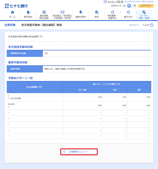 総合振込に用いる先方負担手数料とは、別の管理になります。総合振込の先方負担手数料については、「先方負担手数料の照会(総合振替)」をご参照ください。
