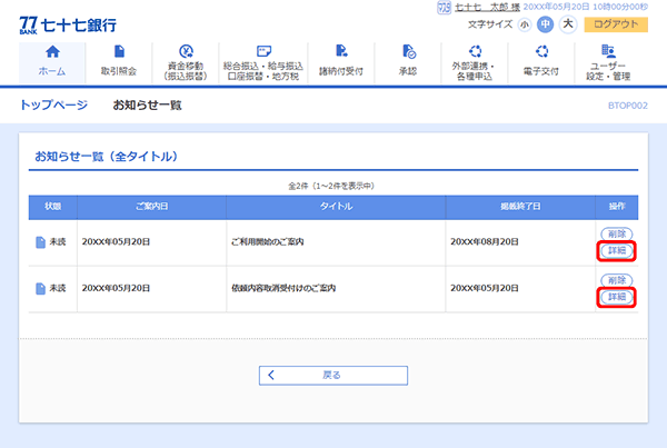 内容をご確認したいお知らせの[詳細]ボタンをクリックしてください。