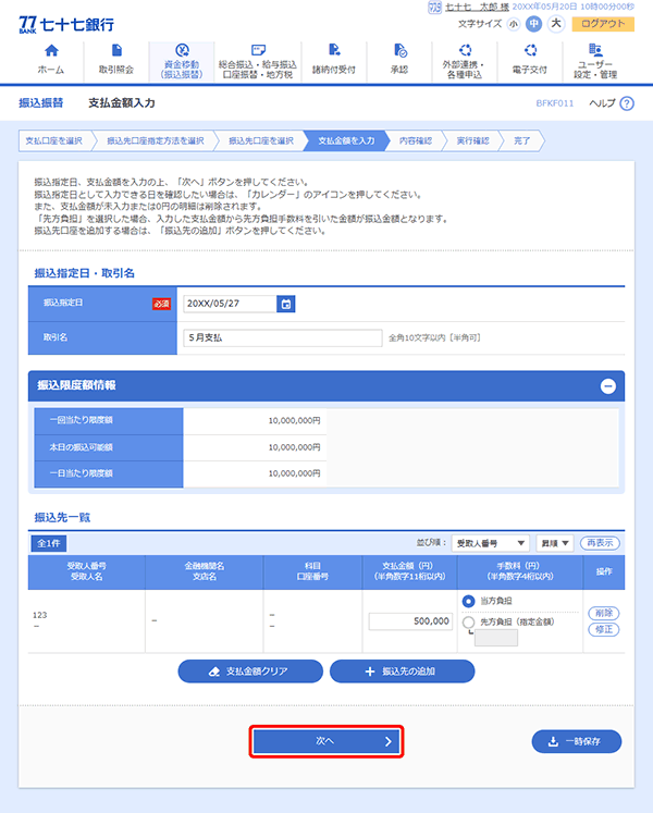振込指定日、支払金額、手数料を入力し、[次へ]ボタンをクリックしてください。