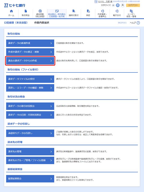 ご依頼の内容は、口座振替(本支店型)「作業内容選択」画面の[請求データの取引状況照会]ボタンから確認することができます。