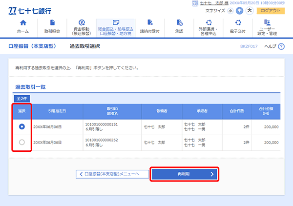 対象の取引を選択し、[再利用]ボタンをクリックしてください。