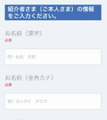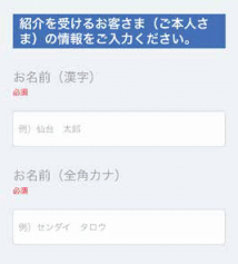 「紹介を受ける方」の画面で、ご本人さまの情報と紹介者の方の情報を入力します。