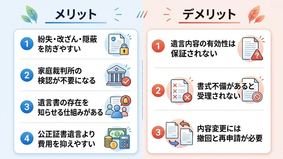 ここからは、法務局の遺言書保管制度を利用するうえでのメリットとデメリットを整理します。