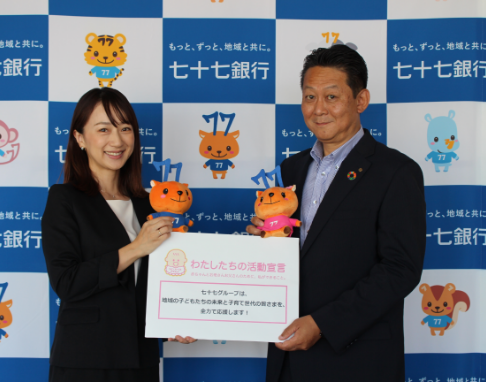 七十七銀行は、「働き方改革」を通じた生産性の向上、ならびに仕事と家庭生活の両立に向けた取組みを推進することにより、個々人の能力を最大限に発揮して活躍できる環境の実現を目指し、ここに宣言します。
