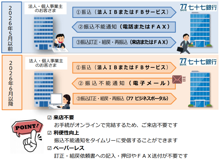 法人・個人事業者向けインターネットバンキングにご登録している電子メールアドレスあて、振込不能通知をお送りするほか、77ビジネスポータル画面上で振込の訂正、組戻および再振込依頼をお手続きすることができます。